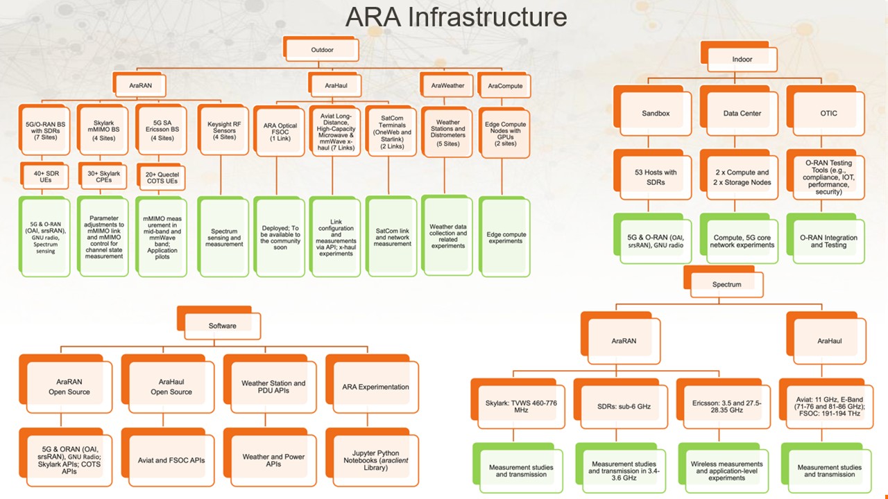 While 5G is increasingly being deployed across the world and research in 6G is gaining momentum, realizing the vision of next-generation (NextG) wireless services such as ultra-reliable, low-latency communications (URLLC) for control and extended reality (XR) applications requires radical innovations across the whole network stack from the physical layer to MAC layer and above and end-to-end across radio access networks and core networks. In addition, the emergence of open-source 5G platforms such as OpenAirInterface and srsRAN enables whole-stack programmability and end-to-end softwarization of cellular systems from user equipment (UE) to base stations and core networks. For whole-stack, end-to-end research and innovation in NextG and for fully-programmable, over-the-air experimentation, ARA features at-scale deployment of advanced software-defined radios (SDRs) both indoor and in outdoor, real-world agriculture and rural settings, as shown in the figures below.